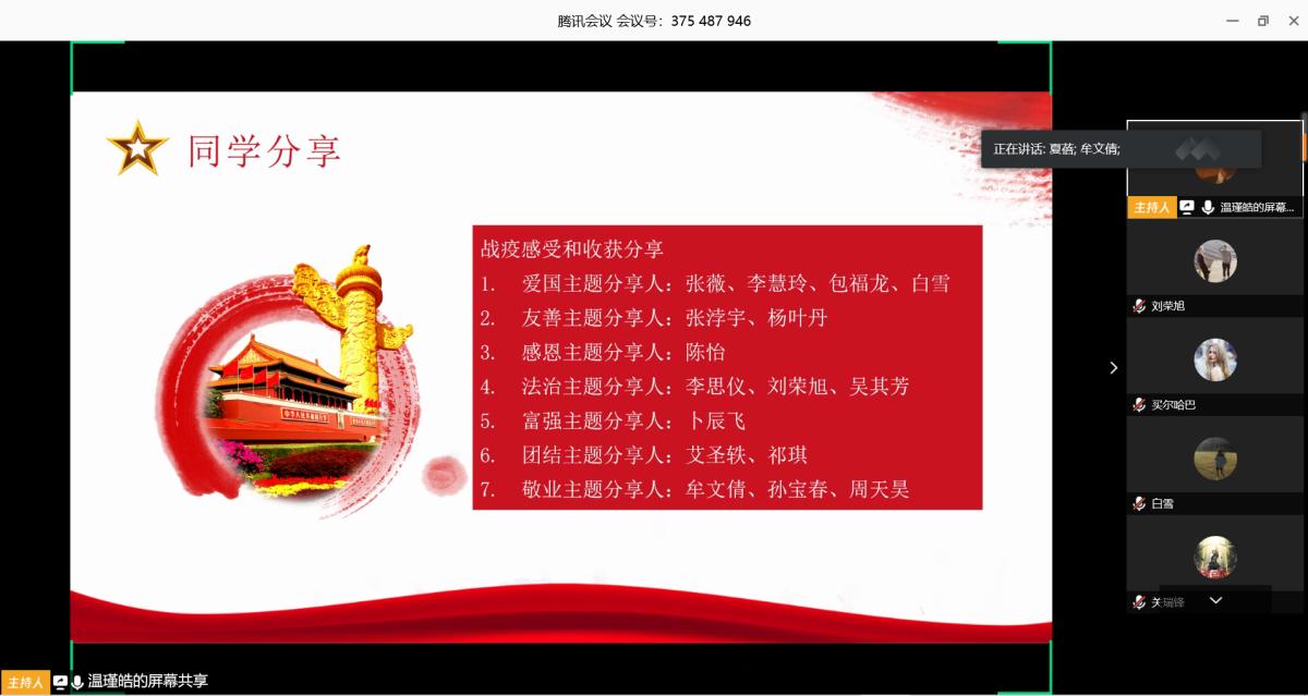 2020年4 月1日,18经济二班开展了“疫期成长”暖春主体班会,在班会上同学们分享了自己在疫情期间的收获和感受还有家乡的战疫故事,大家围绕爱国、友善、感恩、法治、富强、团结、敬业等关键词进行了精彩的分享。
