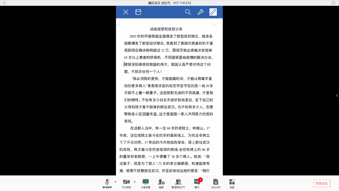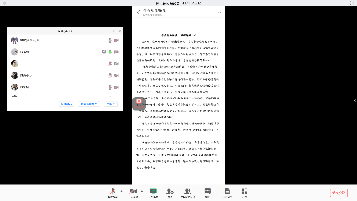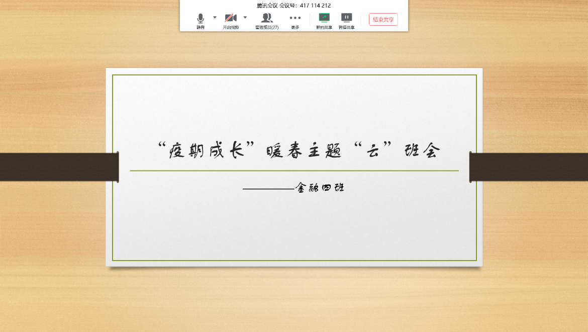 应学校号召,19级金融四班组织全班同学,于近日开展了一次疫情期间分享感受的班会。此次班会目的旨在分享疫期成长感悟、交流心得,同时增强班级凝聚力。