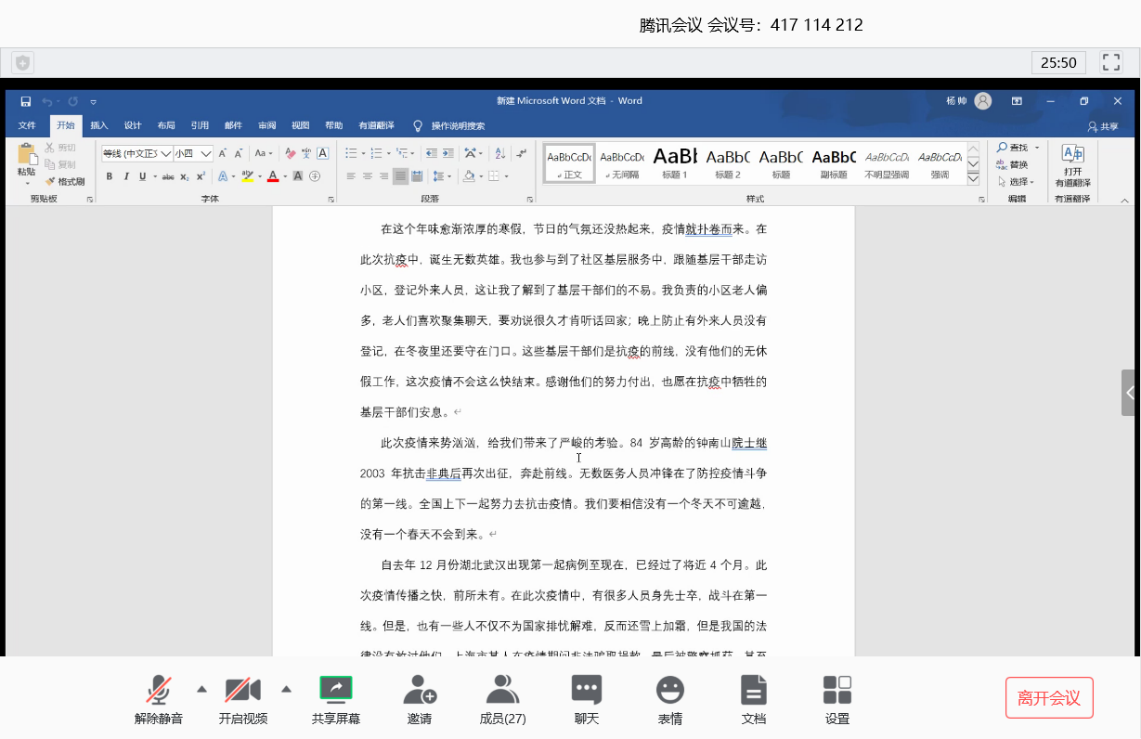 会议中,同学们不仅表达了对疫情期间全国人民戮力同心、携手抗疫的感慨,还谈到了对当下青年员工的责任与使命的理解。有同学谈到:在这场没有硝烟的战争背后,我们看到的是千千万万中华儿女挺身而出、勇担大任的凛然大义;是大家众志成城、同舟与共的团结一心。这一份份沉甸甸的爱国之情时刻温暖着大地上生活的每个人。有同学表示:身为青年人的我们,虽然没有像医务工作者一样在抗“疫”一线救死扶伤,但今后我们会以义务工作者位榜样,时刻牢记习近平总书记对我们青年员工的殷切期望,努力学习专业知识,练就过硬本领,锤炼品德修为,用实际行动肩负起新时代青年的使命和担当。