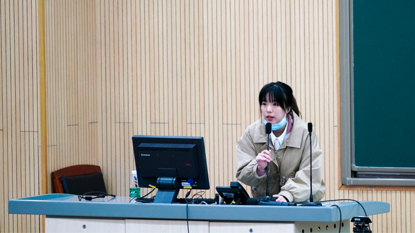 随后,由在大创项目中获得了优异成绩的2020级唐铭苛同学向大家分享了关于参加大创活动的经验与方法。她从什么是大创、大创的准备过程以及大创活动的注意事项等几方面向同学们清楚阐述并仔细说明了她参与大创的经验。
