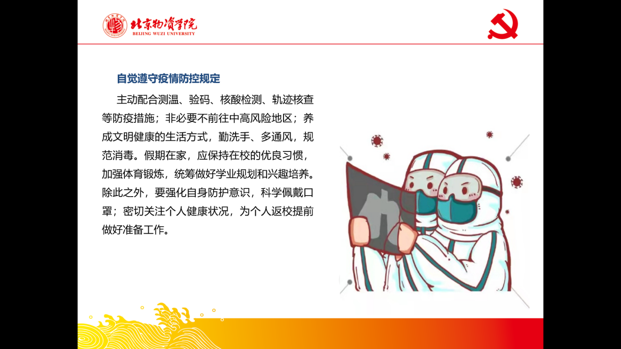 最后,由冯琪老师进行了强调总结,坚持每日健康打卡,同时呼吁身边人进行打卡;遵守防疫要求,保护个人健康,减少外出和聚集性活动;在自己力所能及的范围内投入到抗疫活动中。为本次会议画上了圆满的句号。