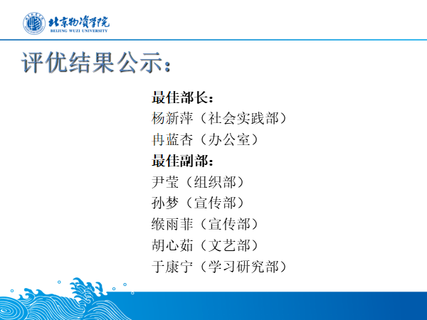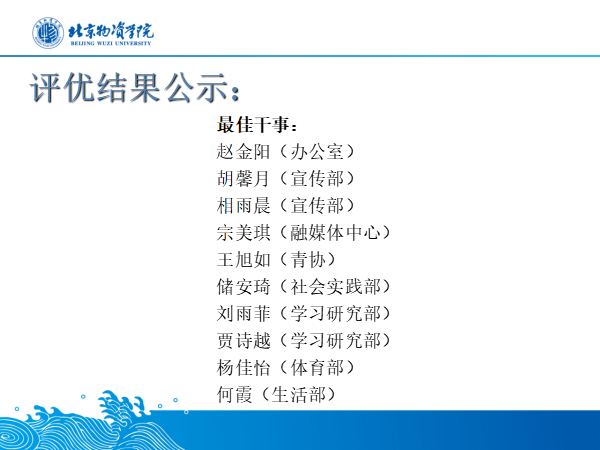 大会第二项,进行评优结果公示。304am永利集团分团委员工会轮值主席常含笑同学公布获奖名单,并鼓励获奖同学锐意进取、奋楫笃行,以不畏艰险的勇气与迎难而上的斗志带领员工会全体成员共同进步、共同成长!