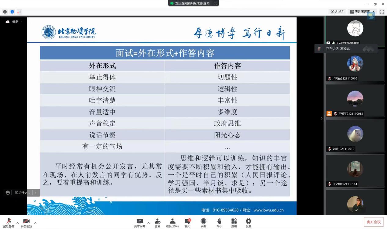 最后进行分享的是冯凌志学长,他已被北京市平谷区财政局录取。他以个人情况、公务员基本介绍、备考经验、面试、常见问题以及心得六方面进行了分享。他强调,在考试时,要有合适的策略,合理分配时间;在备考上,要定期的复盘,着重复习真题。以平和的心态开始,时刻保持着认真的态度直到最后。