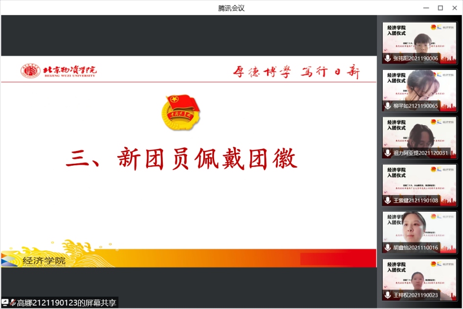大会第三项,新团员佩戴团徽,并在王紫健同学的带领下进行大会第四项,新团员入团宣誓。