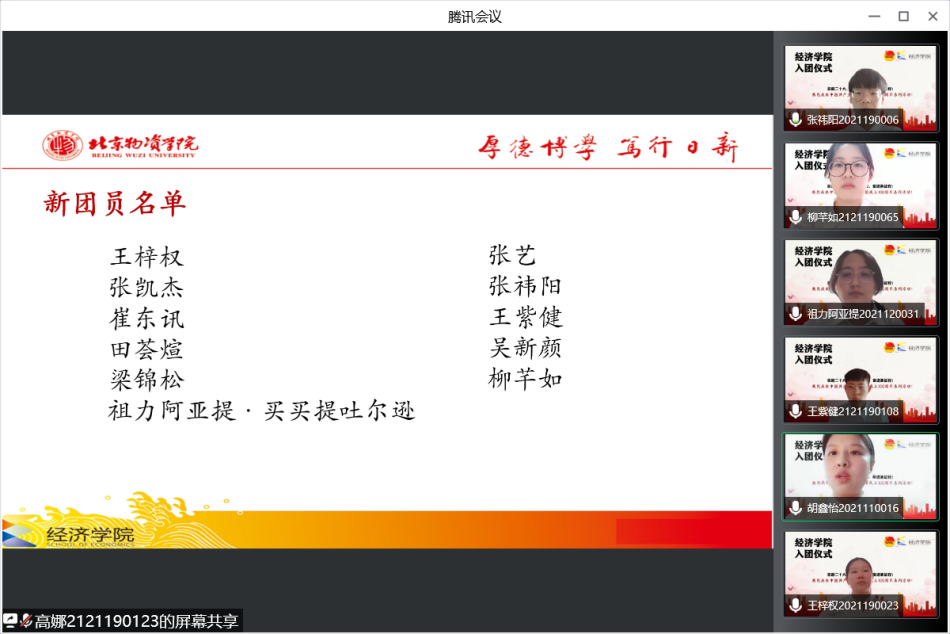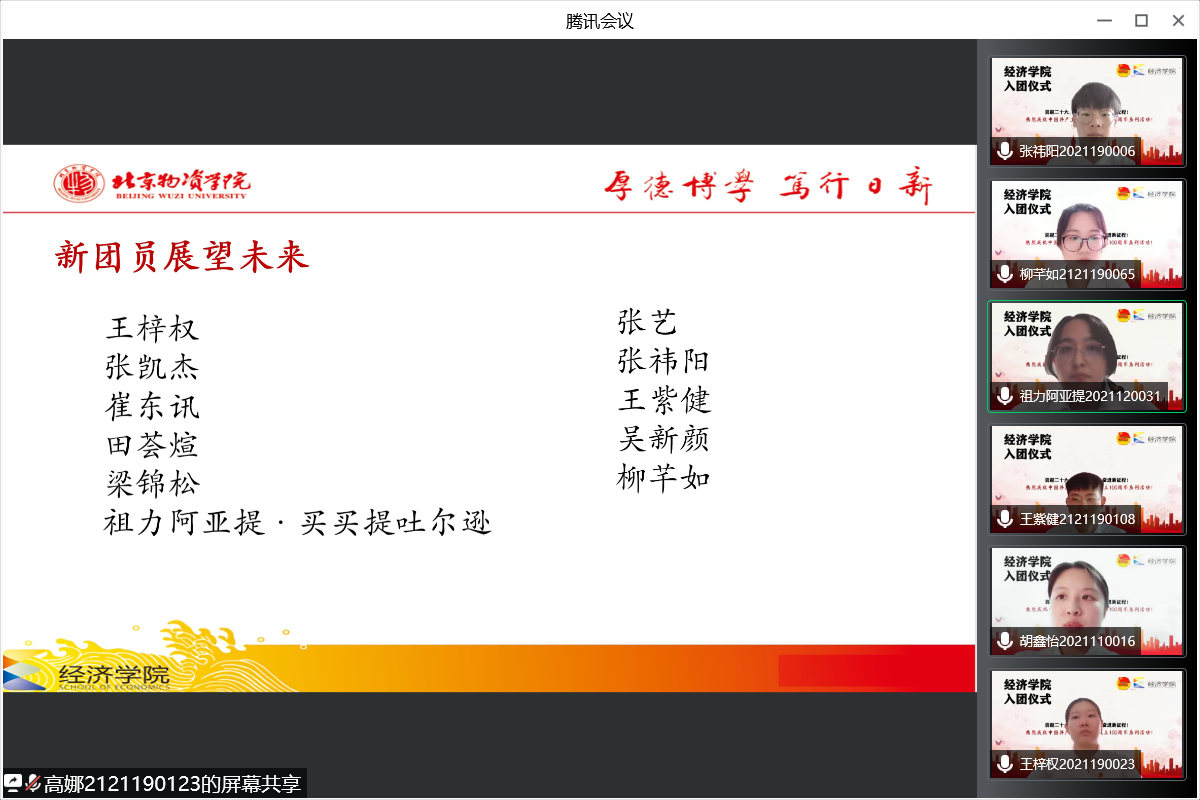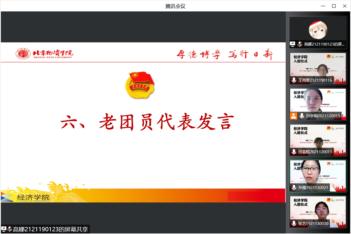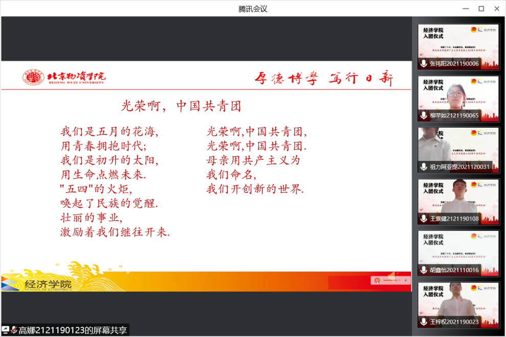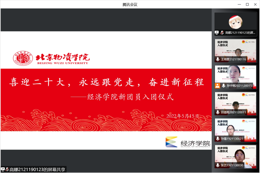 今年是党的二十大召开之年,也是中国共产主义青年团成立100周年,为进一步弘扬五四精神,激励和引领团员们后植爱党、爱国、爱社会主义的情感,让红色基因、革命薪火代代相传,304am永利集团分团委组织部于2022年5月16日中午13:00为2021-2022年度发展的11名新团员举行线上入团仪式。本次入团仪式由304am永利集团组织部胡鑫怡同学主持,304am永利集团分团委书记冯琪老师,及相关员工干部、全体新团员和老团员代表参加。