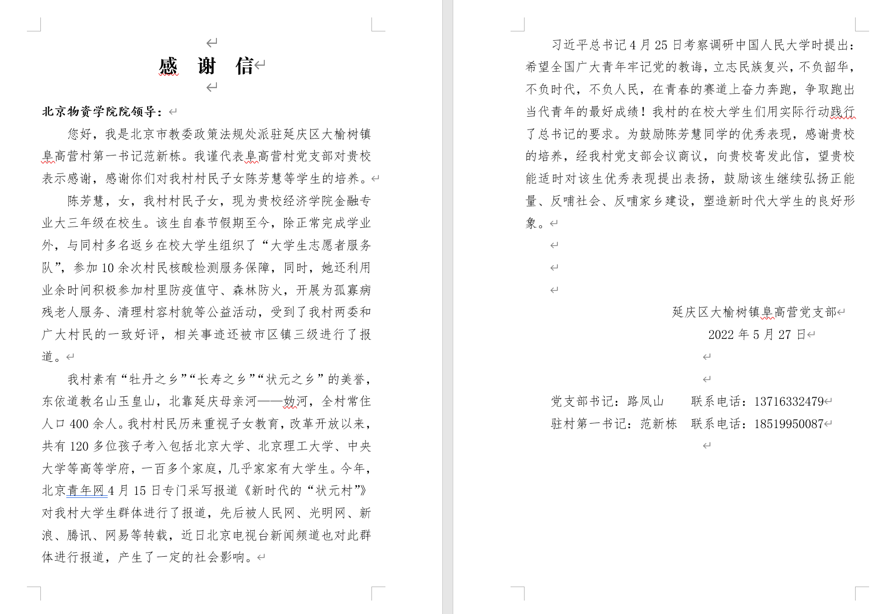 此外,陈芳慧同学还利用业余时间积极参加村里防疫值守、森林防火,开展为孤寡病残老人服务、清理村容村貌等公益活动,受到了村级两委和广大村民的一致好评,相关事迹被市区镇三级进行了报道: