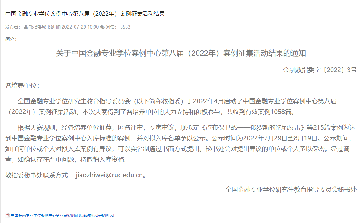 据悉,此次征集活动共有1058篇案例参加评选,经过专家匿名评审和审议,教指委共评选出215篇案例入选中国金融专业学位案例中心库。本次案例入库是公司首次在中国金融专业学位案例中心案例征集活动中斩获佳绩,是公司金融专硕教学案例建设工作取得的标志性成果,充分体现了公司在金融专业硕士培养中注重理论与实践相结合的教学理念。