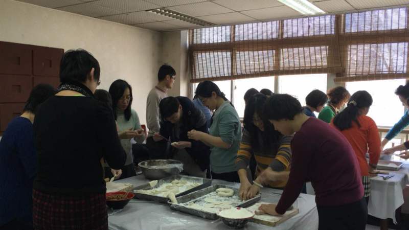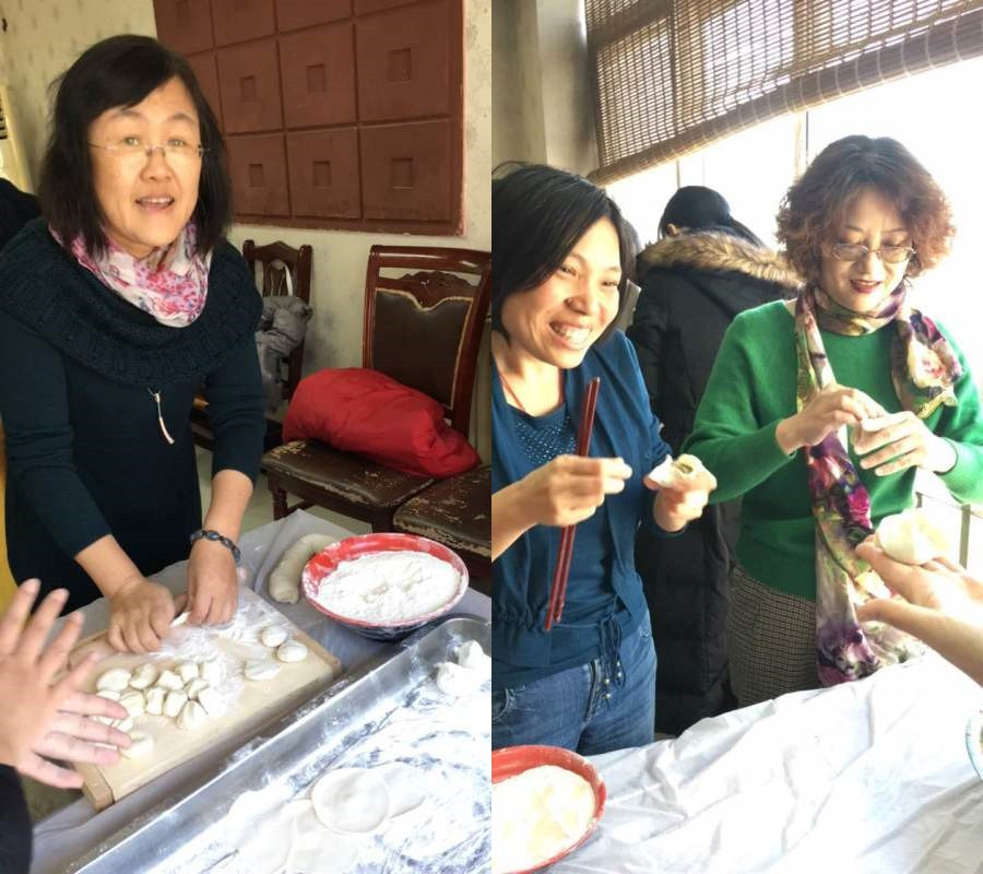 时值学期末,老师们在繁忙的工作之余,纷纷献技,擀皮、包饺子、运输和现场摄影报道,忙得不亦乐乎。北京饺子、山西饺子、河南饺子、内蒙饺子等各地特色同桌竞技,更有南方的老师们抓紧现场学艺。
