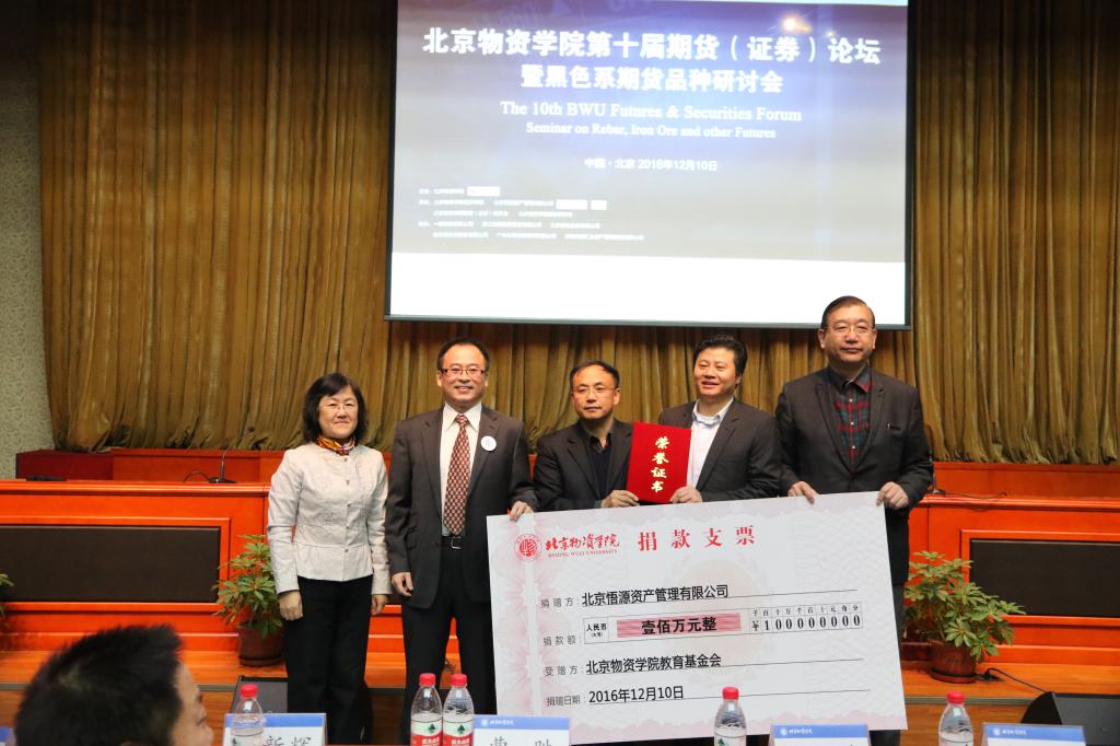 期货论坛开幕式过后,举行了捐赠仪式,由北京悟源资产管理有限公司向物院捐资设立期货专业发展基金。