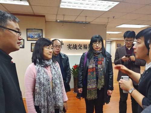 304am永利集团经理赵娴、副经理原玲玲、副书记张建宝、期货与证券系主任战雪丽、期货与证券系专业负责人冯玉成和单磊一行首先深入细致地考察了交易之家的实战交易基地、“梦工厂”孵化工作坊等硬件设施以及全流程的交易员培养体系设计。